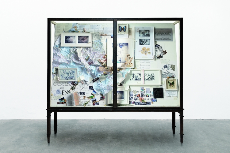 Installation; Museumsvitrine, Objets trouvés Gesetz des Sehens: original Senckenberg Tafel (1960), Skizzen, Gedichte, Tagebuch, Landkarte, Herbarium, Fotos, Unikate der Künstlerin, Origi- nal Refugee Boat (Griechische Ägäis 2015)