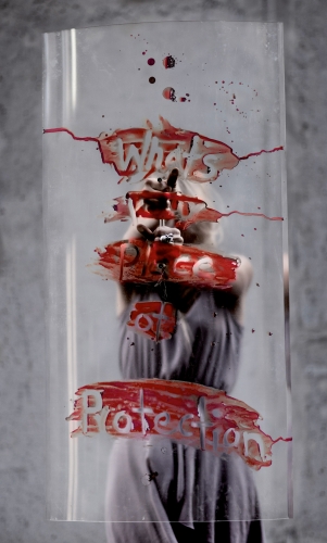 Installation: Polizeischilder, Acryl, Ketten, Eigenblut, Archivleinwand bedruckt