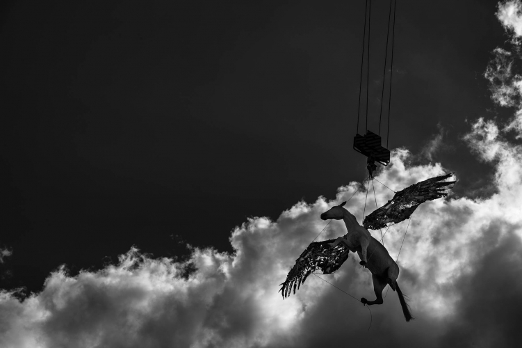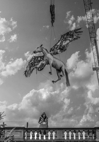 Before sweeping into ‘lagoon city’ for a couple of months, “Pegasus” travelled along the edges of Europe, in Turkey and Greece, where, on his journey from the artist’s atelier in Frankfurt, the steed followed the paths of illegal immigrants who sail across the sea to Europe. The magic metaphor of “Pegasus” was what prompted the artist to set off on her performance odyssey—a performance that addresses central questions regarding national borders, refugees, and expulsion due to political and economic factors.