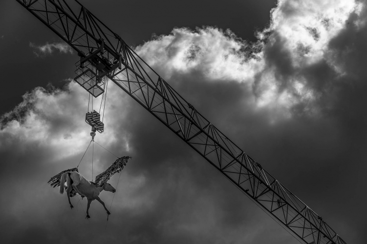 Mia Florentine Weiss nutzt das kraftvolle Bild des gefangenen Pegasus, um auf die Widersprüche Freiheit und Begrenzung, Flucht und Internierung hinzuweisen, die täglich im Mittelmeer eine unheilvolle Allianz eingehen. In der griechischen Mythologie ist „Pegasos“ - Kind des Meeresgottes Poseidon und der Gorgone Medusa – Symbol für Unsterblichkeit, kreative Energie, Inspiration und Freiheit. Um das zu erreichen, müssen auch 2015 Menschen Grenzen überwinden. Doch ihre Würde muss dabei stets unantastbar bleiben.