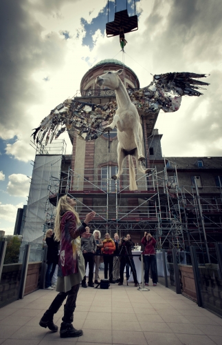 An einem Kran wird der „Pegasus", das zentrale Objekt des Projektes, über das Senckenberg Museum „fliegen und nach seiner Landung dort erstmals öffentlich zu sehen sein. Die Flügel der Skulptur zieren „objéts trouvé, welche die deutsche Künstlerin Mia Florentine Weiss auf ihren Performances um die Welt seit 1999 sammelte. Im Mittelpunkt ihrer Arbeit steht die stets gleiche Frage „What is your place of protection? nach privaten Schutzräumen, die die Künstlerin Menschen unterschiedlichster Nationen stellte.