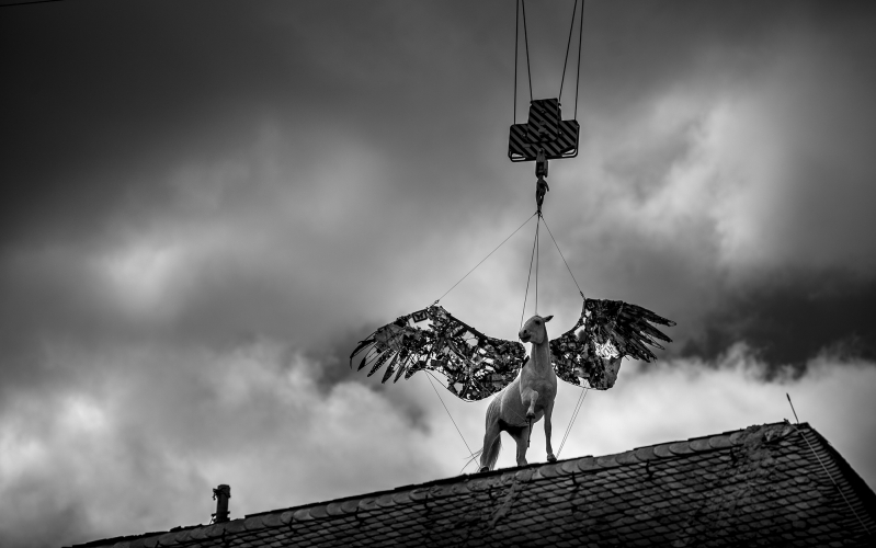 In Venice—a city whose coat of arms is adorned with the winged Lion of Saint Mark, a symbol of the evangelist—the horse stands poised with its powerful wings, which the trailblazing artist assembled out of the various objets trouvés she brought with her from her worldwide performances. Here, the refuge turns into a prison, the wings get entangled in the barbed wire, the longing for freedom ends in entrapment. The installation is her political statement: THE HUMAN BEING - BORN INTO THIS WORLD - AT HOME ON EARTH - DESTROYED BY HIS OWN CURSE!